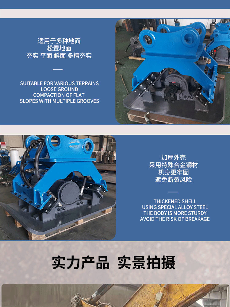 適用于多種地形松置地面夯實(shí)、平面、斜面、多槽夯實(shí)。 主要用于:新舊路面結(jié)合部位、路間邊坡、鐵路堤壩等路基